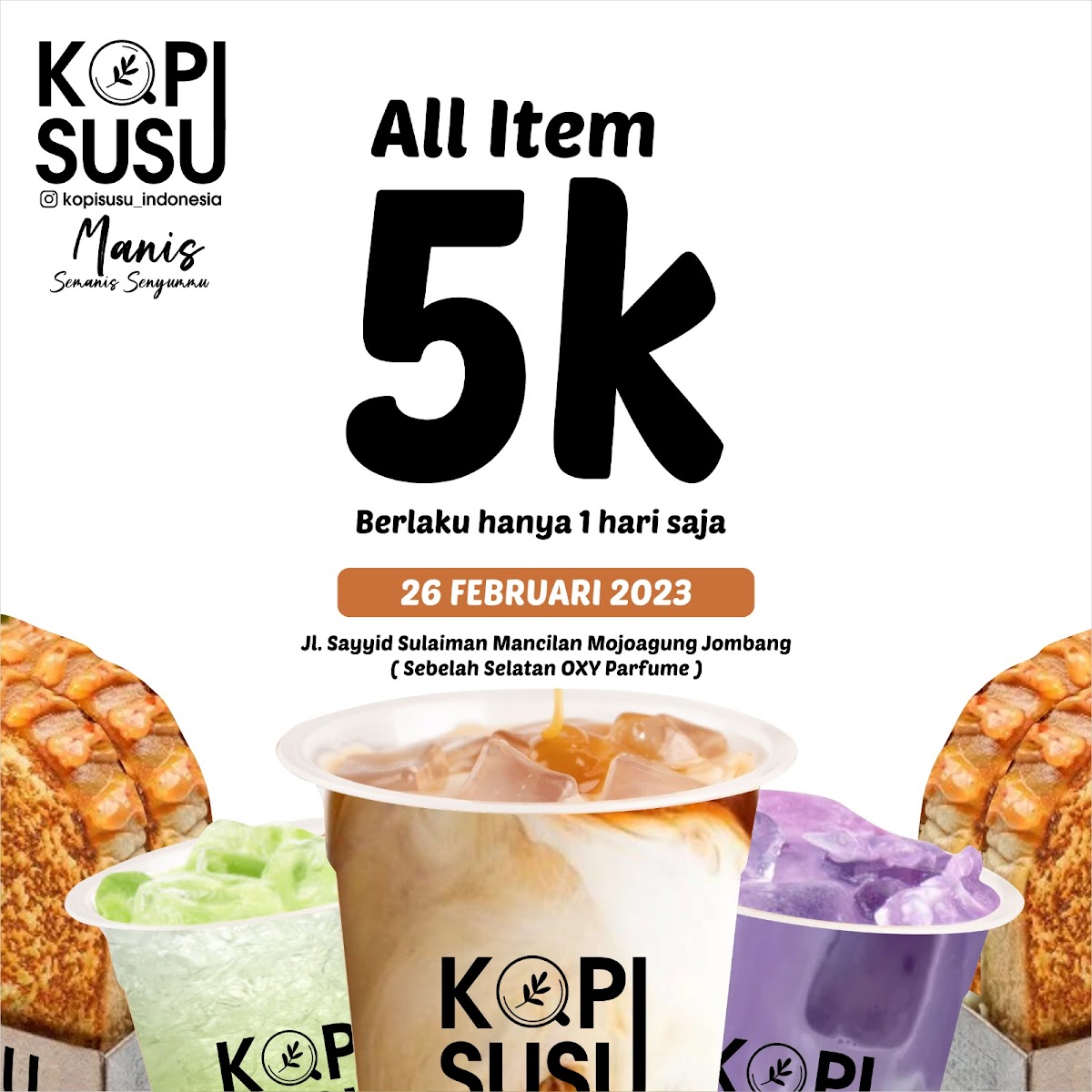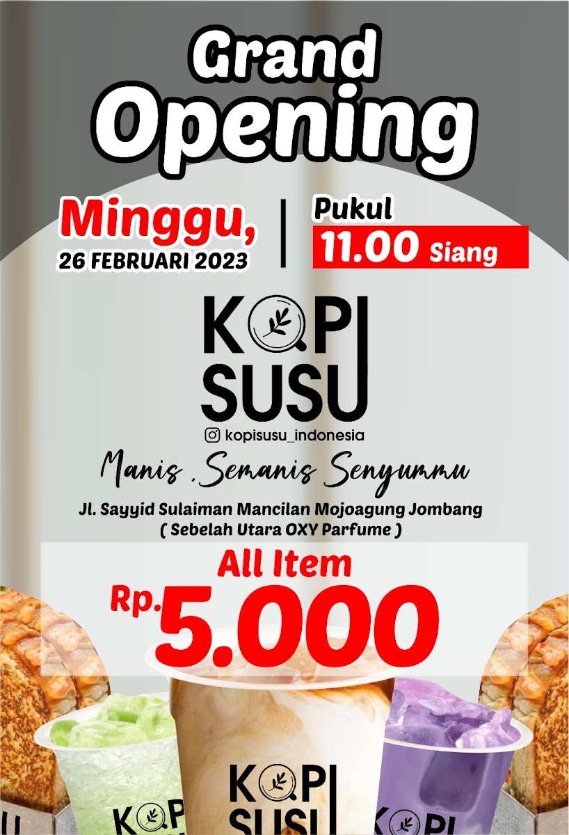Welcome to Kopi Susu Indonesia, where delicious coffee and delightful toast come together. Nestled in Mojagung, this café is a local gem renowned for its rich selection of beverages. Customers rave about the creamy Gula Aren coffee and the luscious Taro tea, both praised for their affordable prices and satisfying flavors.